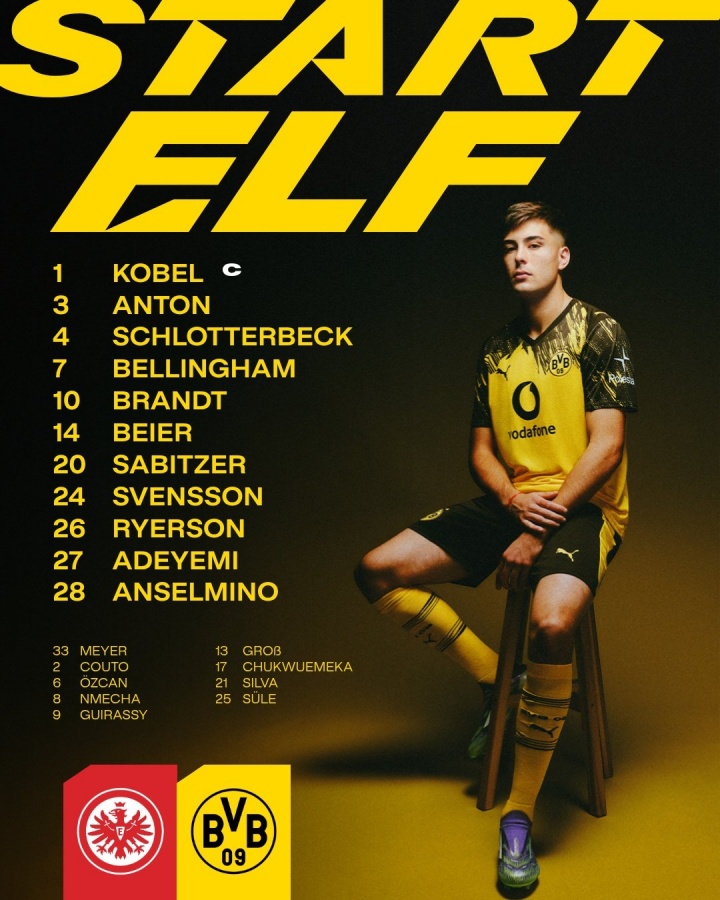 多特蒙德首发:1-科贝尔、3-安东、4-施洛特贝克、7-乔布-贝林厄姆、10-布兰特、14-拜尔、20-萨比策、24-斯文松、26-莱尔森、27-阿德耶米、28-安塞尔米诺