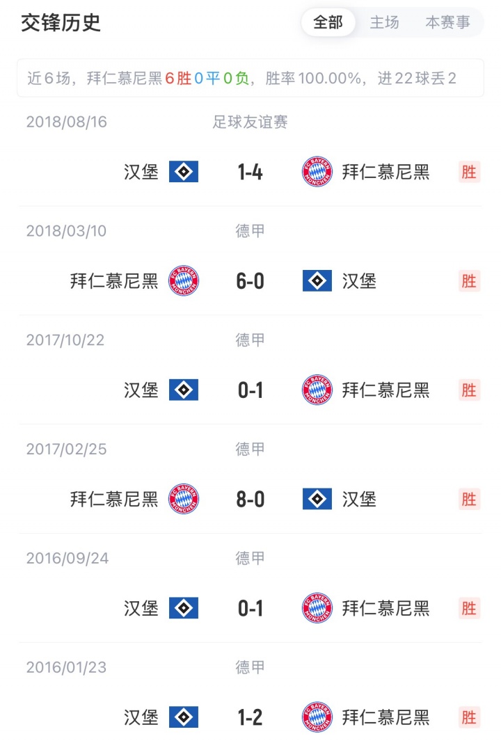 拜仁开赛两连胜暂领跑,汉堡1平1负暂排第15名。拜仁对汉堡已8连胜、19场不败。