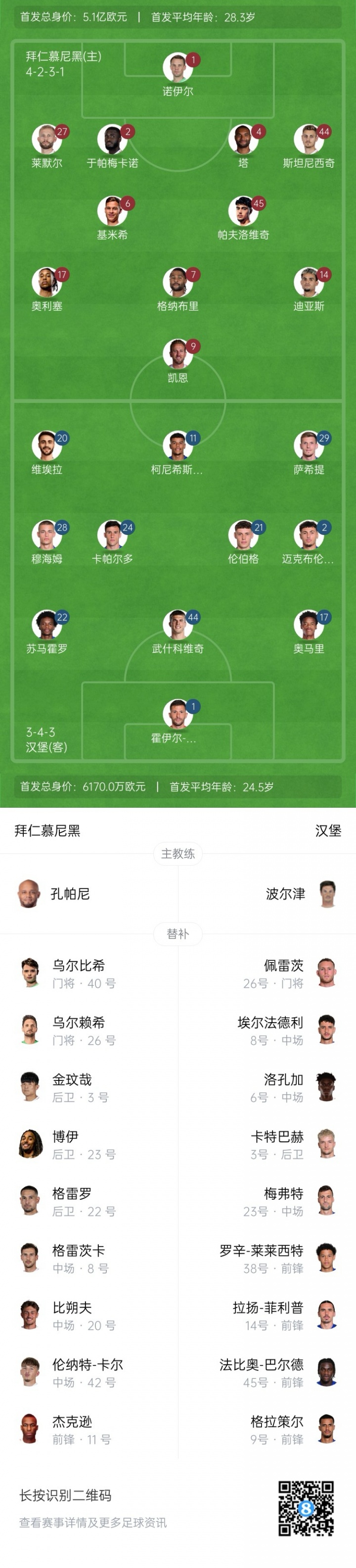 拜仁首发:1-诺伊尔、2-于帕梅卡诺、4-塔、44-斯坦尼西奇、45-帕夫洛维奇、6-基米希、7-格纳布里、27-莱默尔、14-迪亚斯、17-奥利塞、9-凯恩